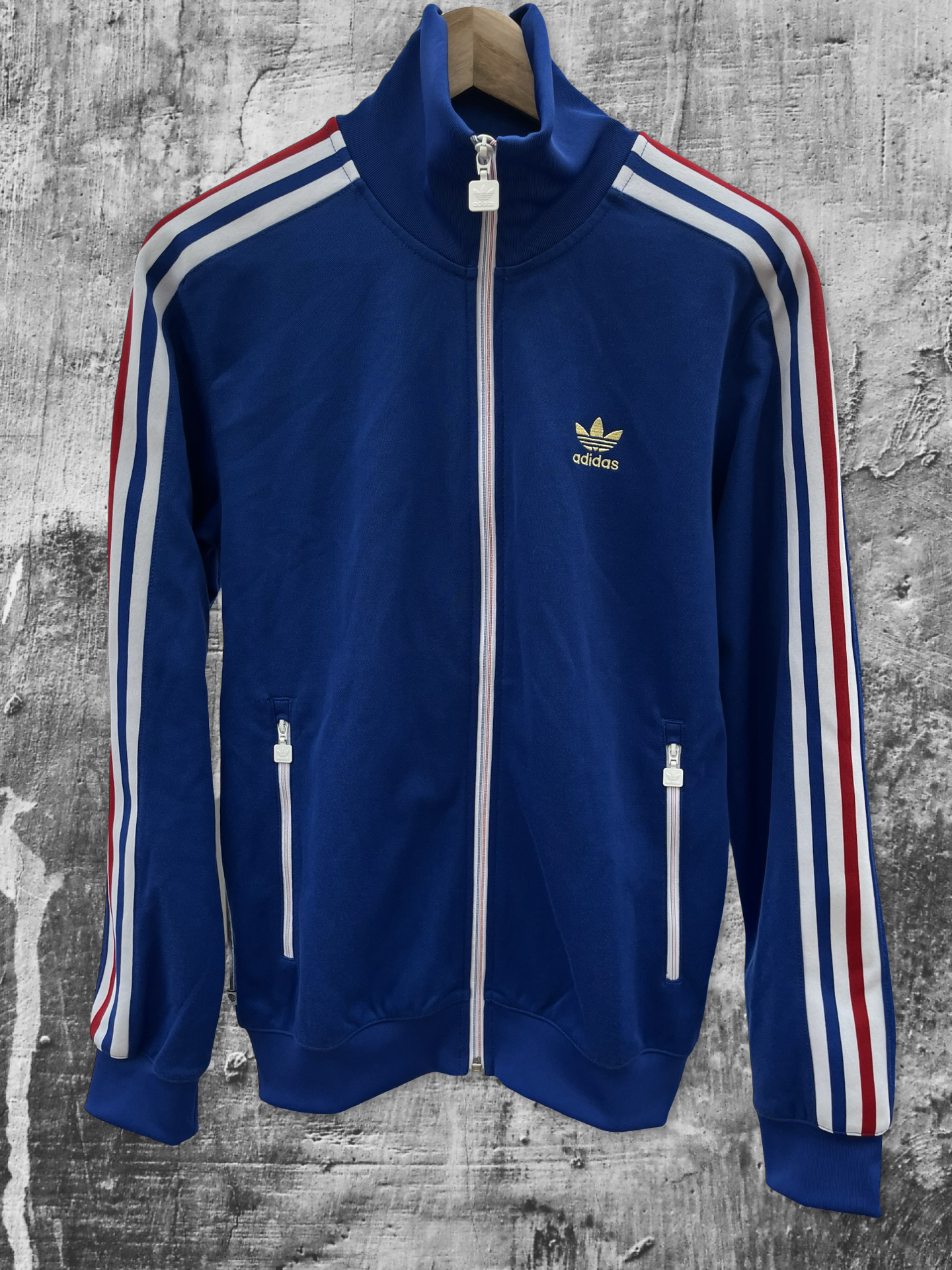 Authentic Adidas Originals track jacket from 2010s, featuring a clean royal blue colorway with classic white and red 3-stripe detailing along the sleeves. Finished with a gold Trefoil logo embroidered on the chest. Full zip closure with zippered side pockets, ribbed cuffs and hem for a comfortable, modern fit.